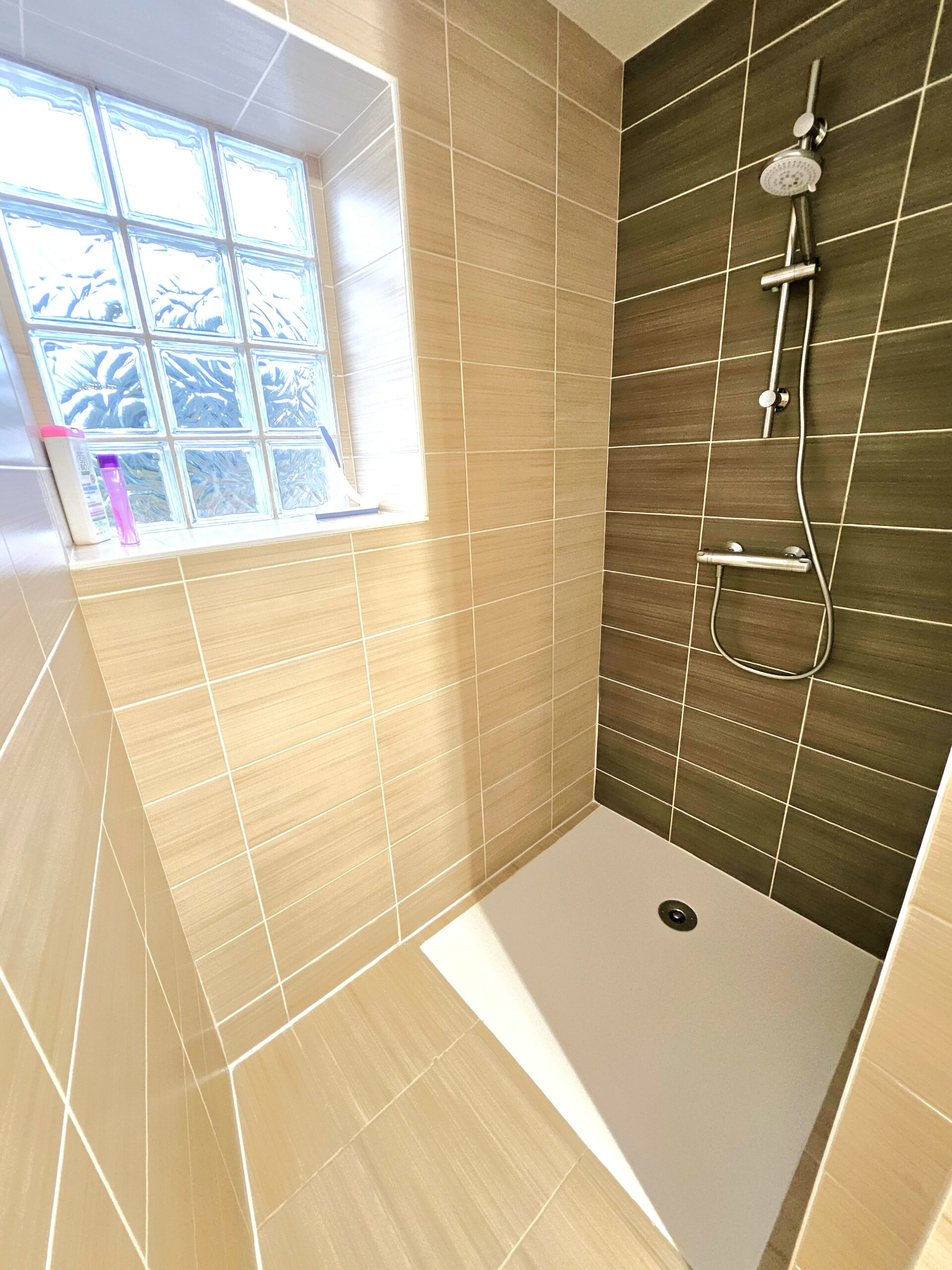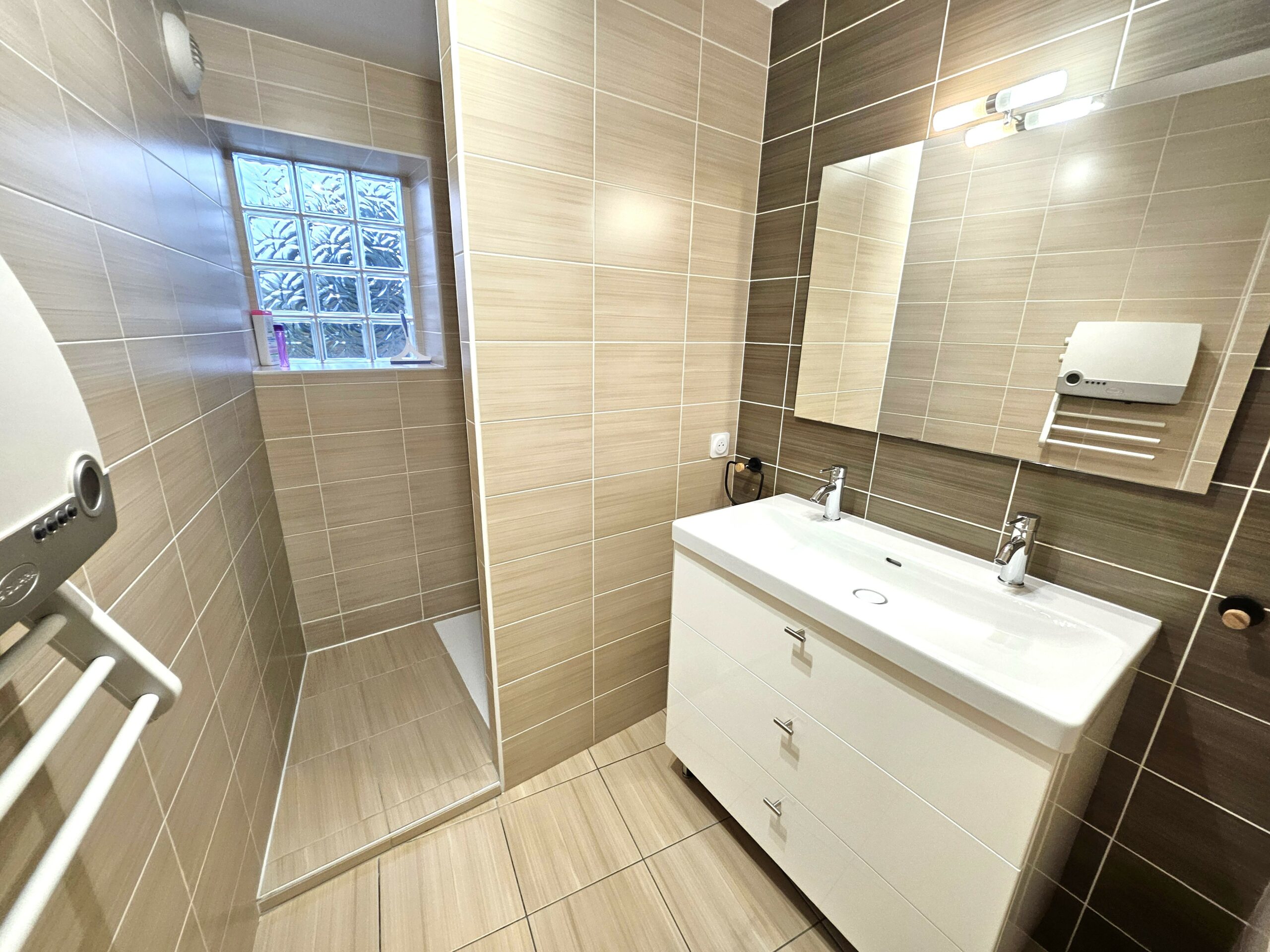 La salle de bain est moderne et pratique avec douche, meuble vasque, sèche-cheveux et radiateur sèche-serviettes. Les WC sont séparés.