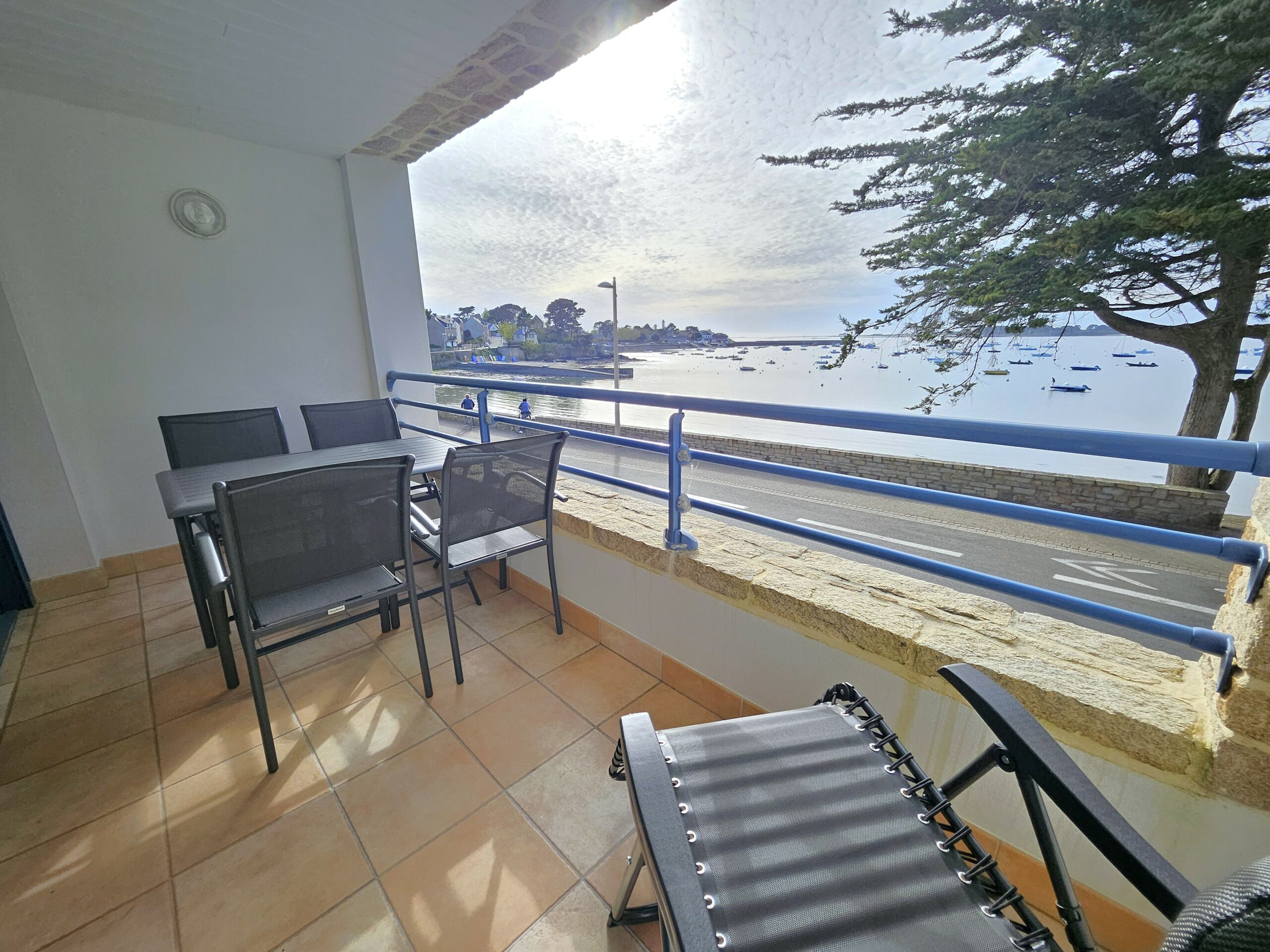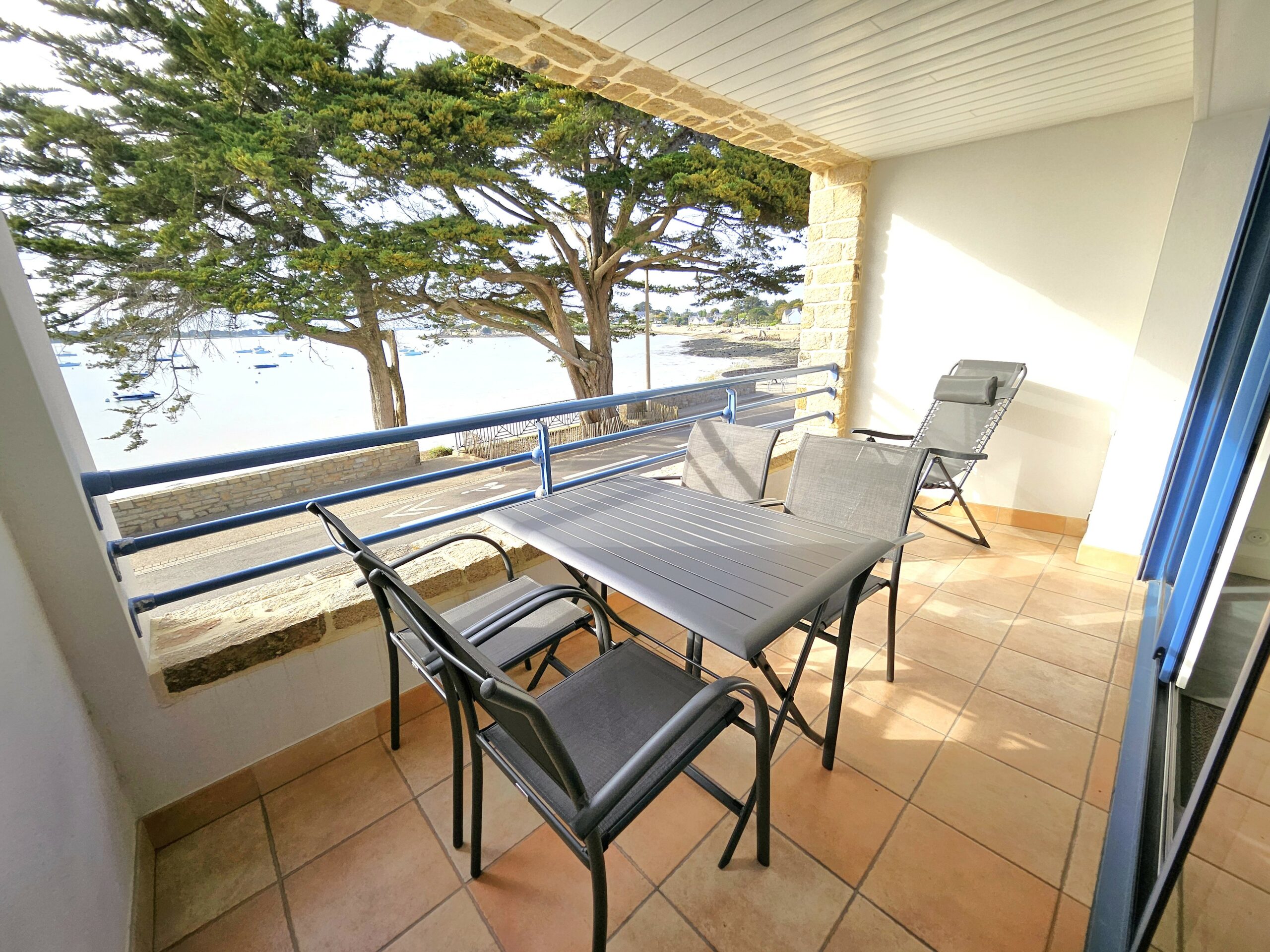 La loggia est aménagée avec salon de jardin, chiliennes et plancha électrique. Un espace parfait pour admirer le ballet des voiliers et savourer vos repas face au Golfe du Morbihan.