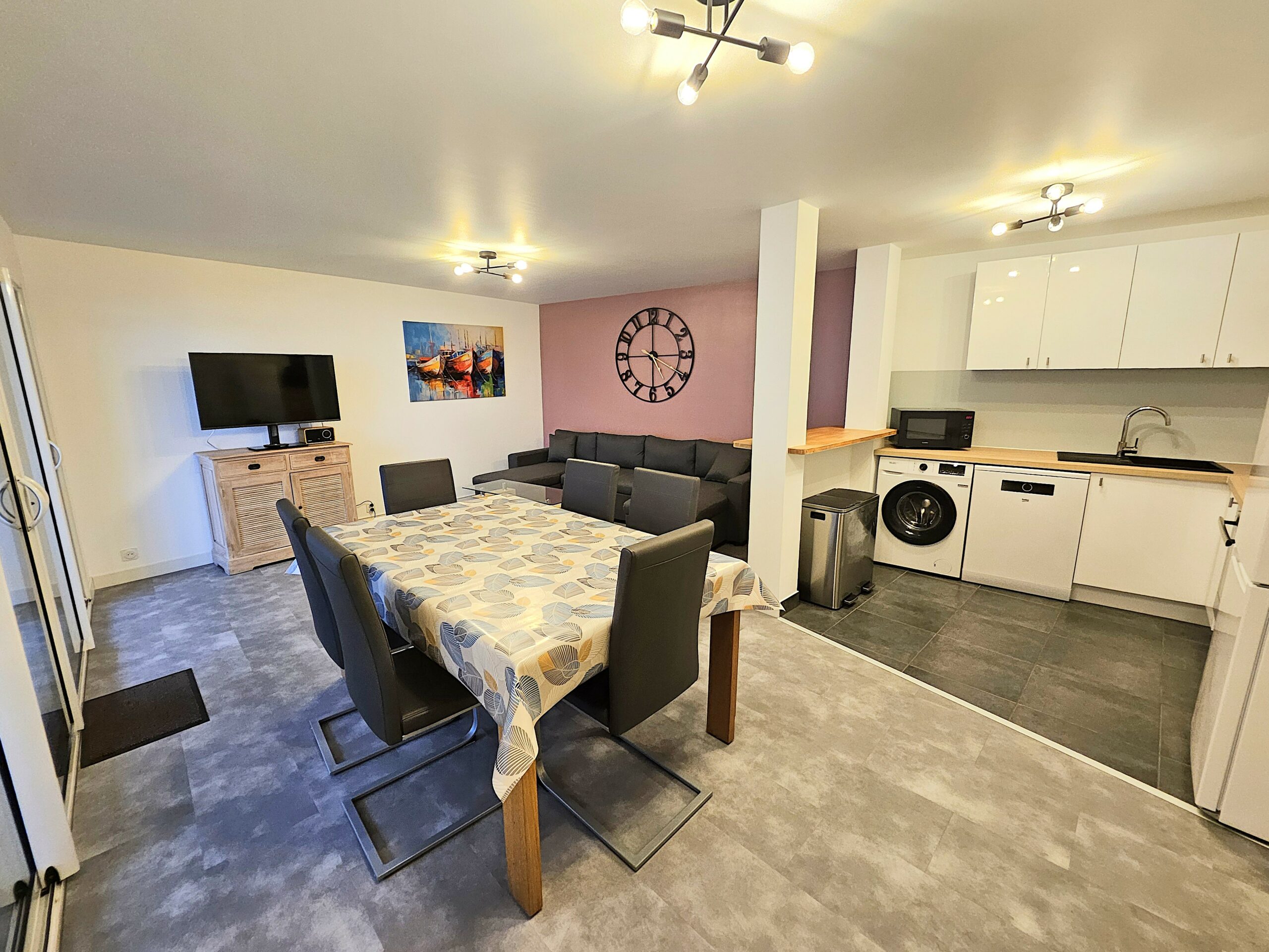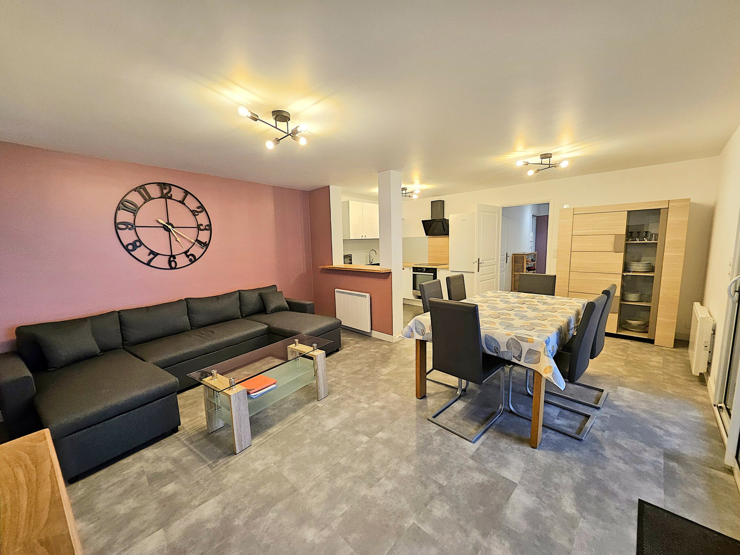 La grande pièce de vie lumineuse est aménagée pour la convivialité : un canapé d’angle à têtières ajustables, un fauteuil, une grande table familiale, une télévision murale orientable et une chaîne Hi-Fi MP3.